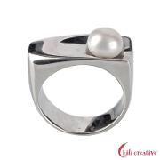 Asymmetrischer Designring aus rhodiniertem Silber mit aufgesetzter weißer Süßwasserperle in der Größe 59.